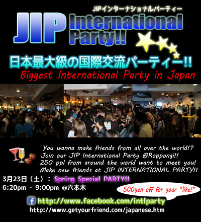 JIP (Japan International Party) は、毎月1回東京のクラブにてインターナショナルパーティーを開催しております。 毎回250名程参加されます。